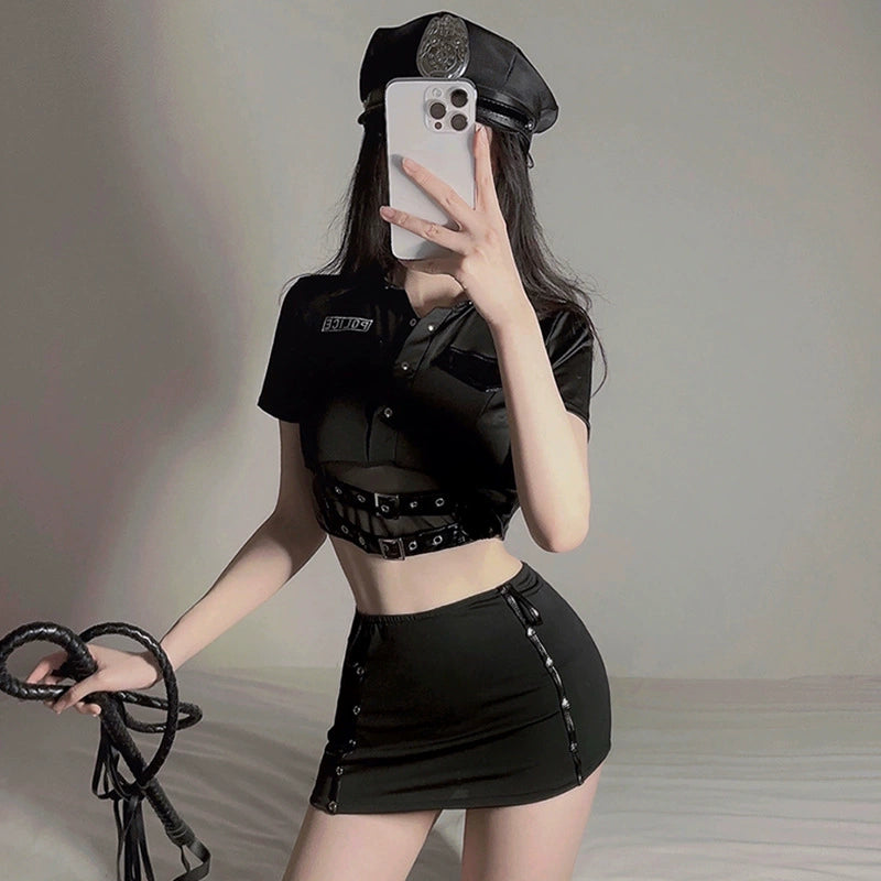 クロップド丈のトップスとミニスカートのセットで、ボディラインを美しく強調。