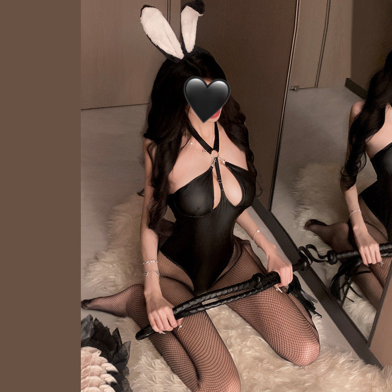 艶やかなレザー風素材で仕上げたバニーボディスーツ。大きく開いたセクシーなカットと、ふわふわのしっぽがポイント。耳付きカチューシャと合わせて、魅惑的な夜を演出します。遊び心のあるデザインで、コスチュームや特別な時間にぴったりの一枚です。